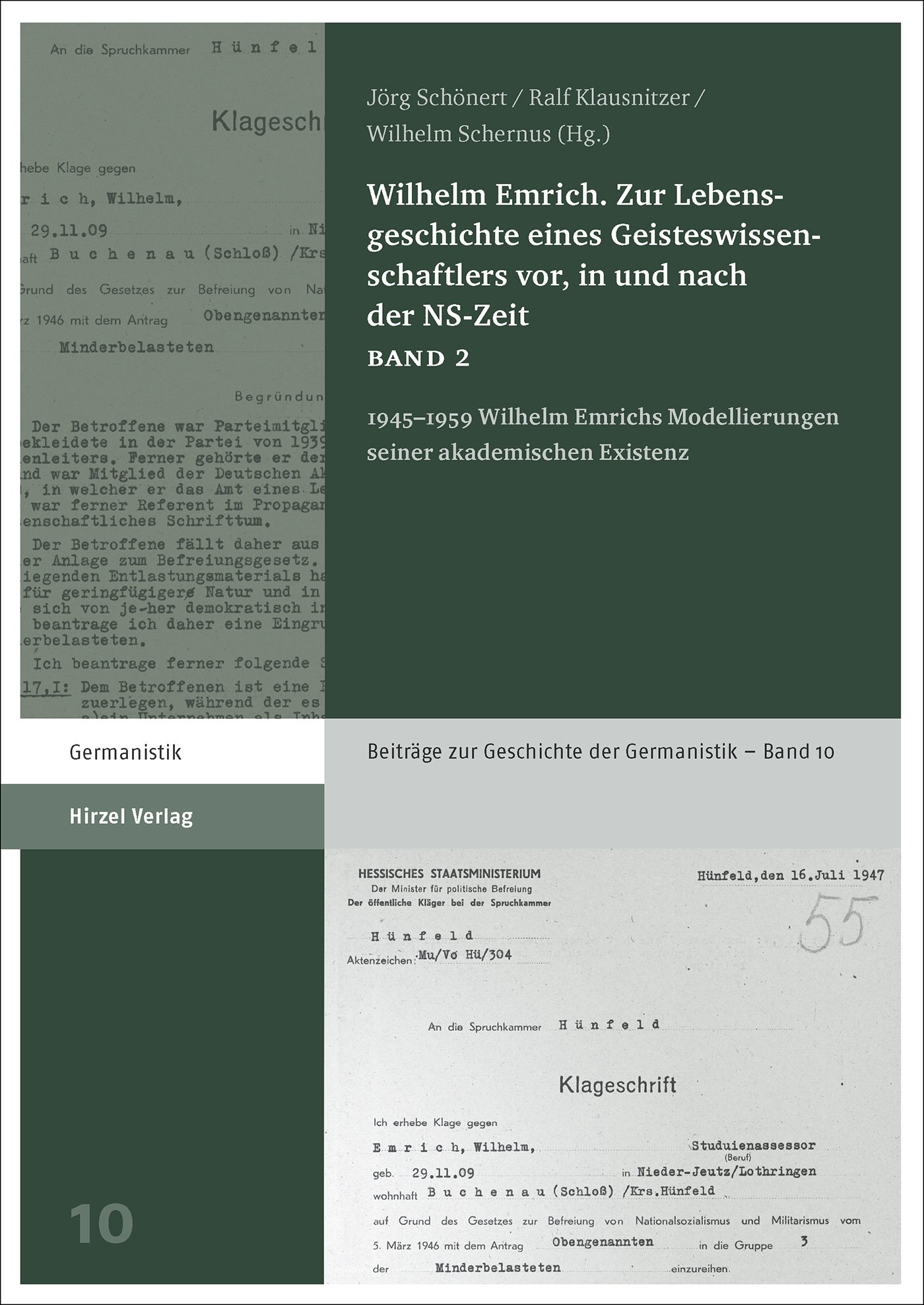 In diesem zweiten Band werden Emrichs Entnazifizierung und seine Vergangenheitspolitik im Hinblick auf die NS-Zeit untersucht – ermöglicht wurde dadurch seine erfolgreiche akademische Karriere. Ergänzend werden Emrichs Korrespondenzen mit Oskar Seidlin und Alfred von Martin aus den Nachkriegsjahren ediert und kommentiert sowie der Ereigniszusammenhang zur Publikation "Der Urfreund" (1996) von Kurt Mautz betrachtet, der als Schlüsselroman für Emrichs politische Biographie rezipiert wurde.